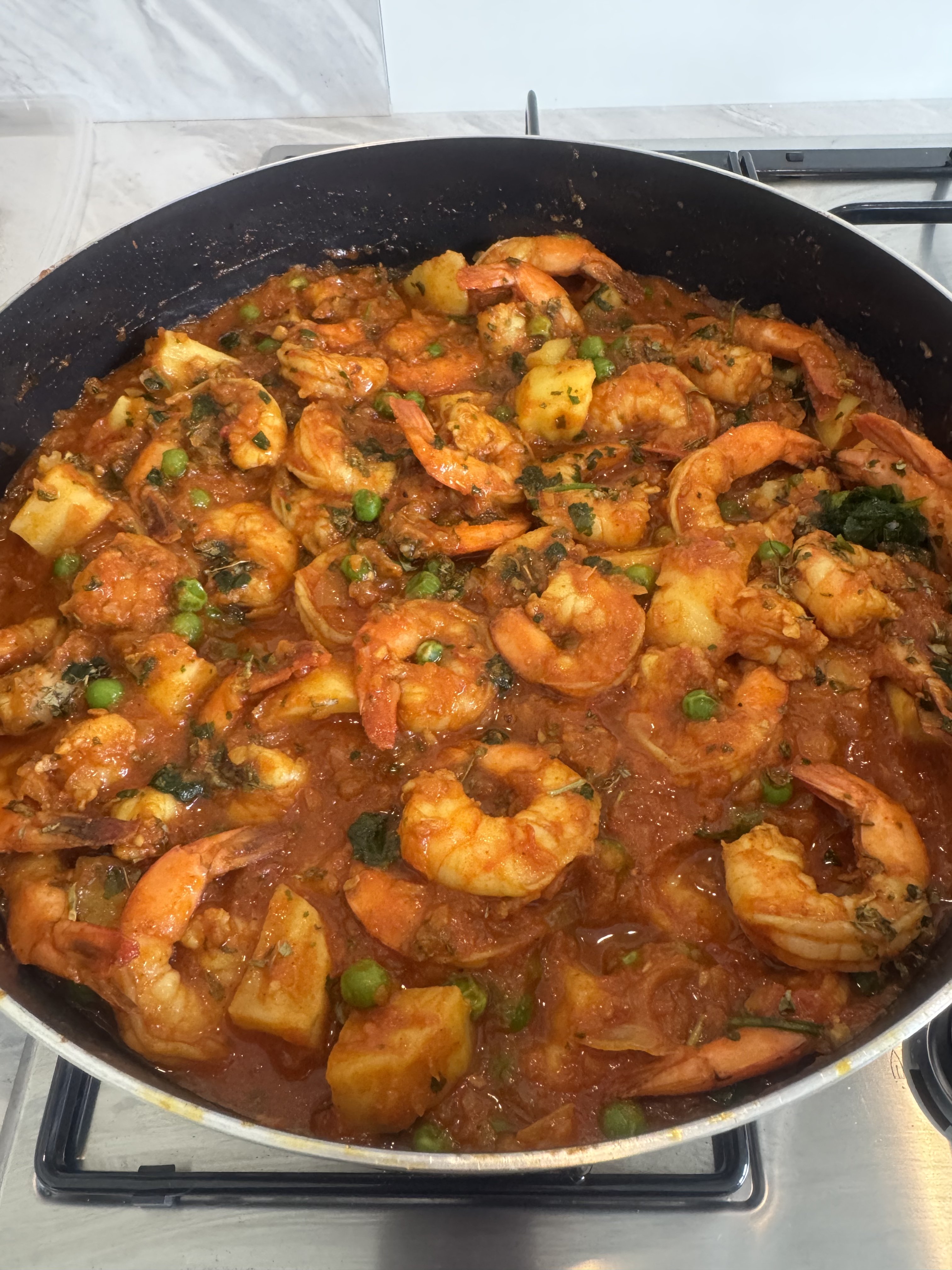 Add the above to chutney, add some water, simmer ± 8-10 minutes. Then add peas & prawns.
